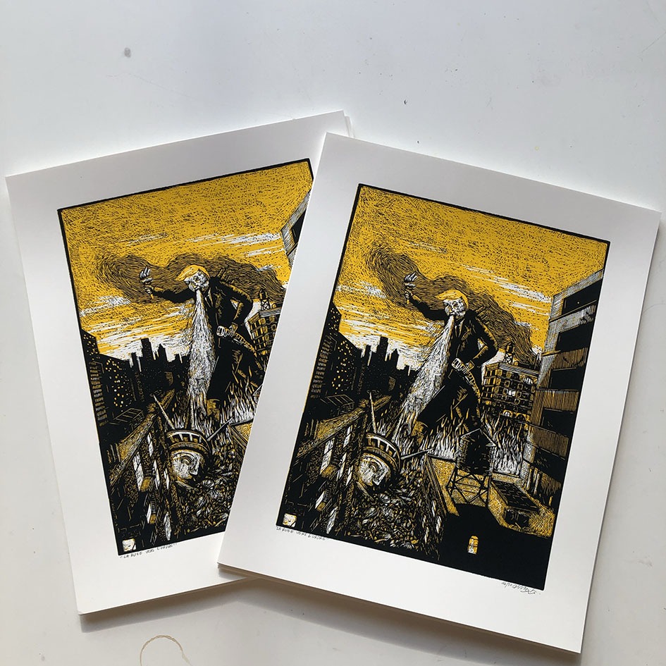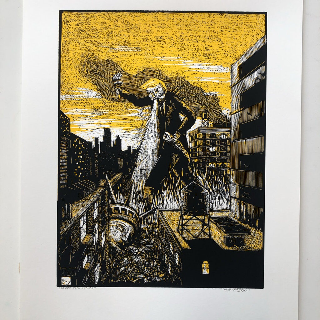 La Ruée vers l’ordre / 2026 Linogravure en 2 couleurs pour une commande du Musée de l’Image d’Épinal dans le cadre de l’exposition Frans Masereel.