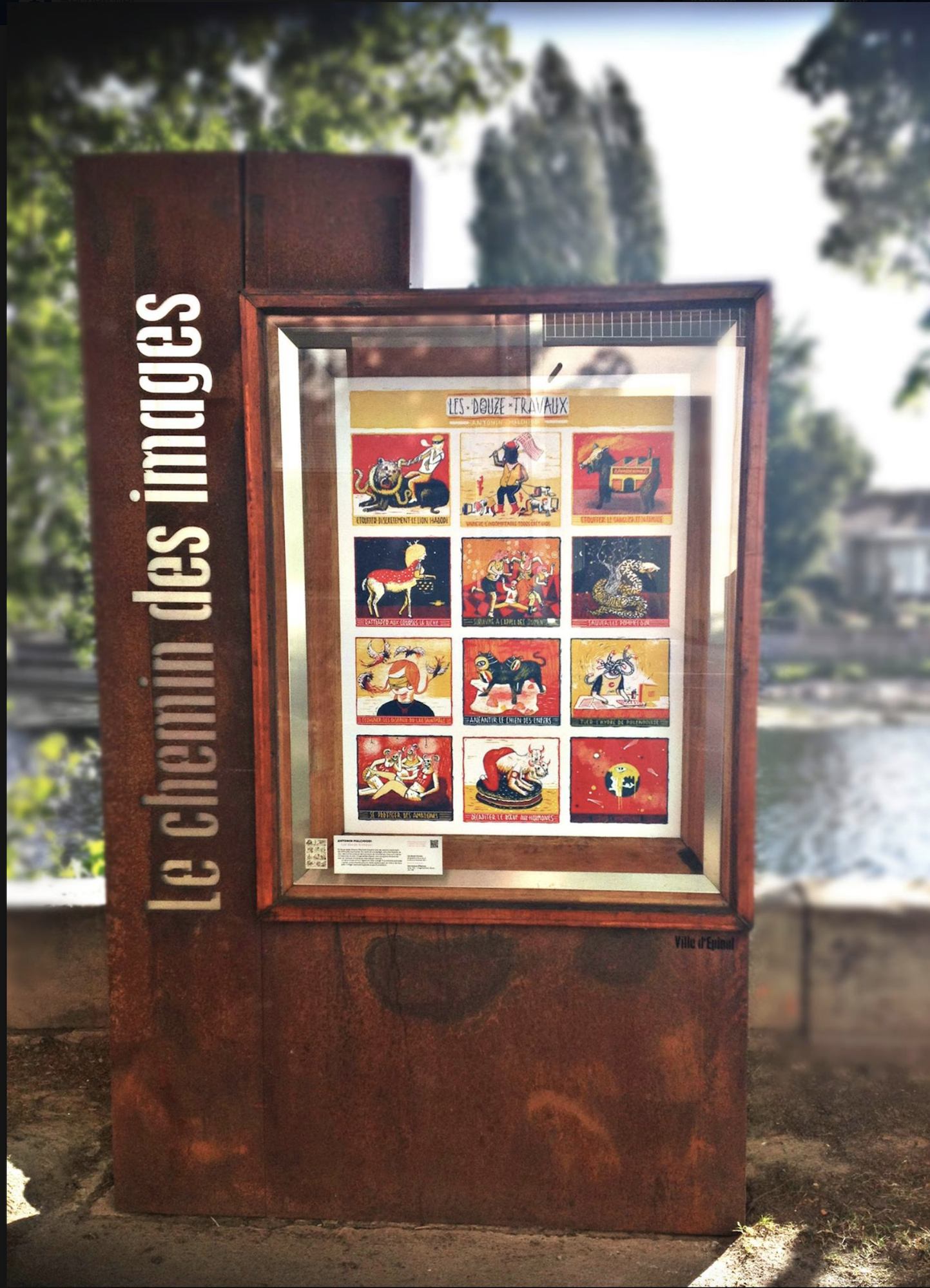En douze cases, Antonin Malchiodi dresse la liste des exploits à accomplir, des difficultés à surmonter. Son point de vue espiègles, sans être fataliste, se veut néanmoins lucide sur les tourments de notre temps. Ceux qu’il met en correspondance avec l’image éditée à Épinal n’ont plus grand chose à voir avec les menaces chimériques anéanties par Hercule. Son image fait référence à la lithographie Les travaux d’Hercule (après 1921) de l’imagerie Pellerin.